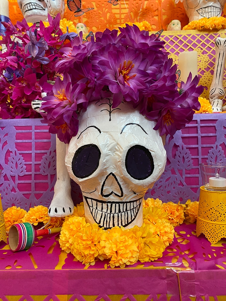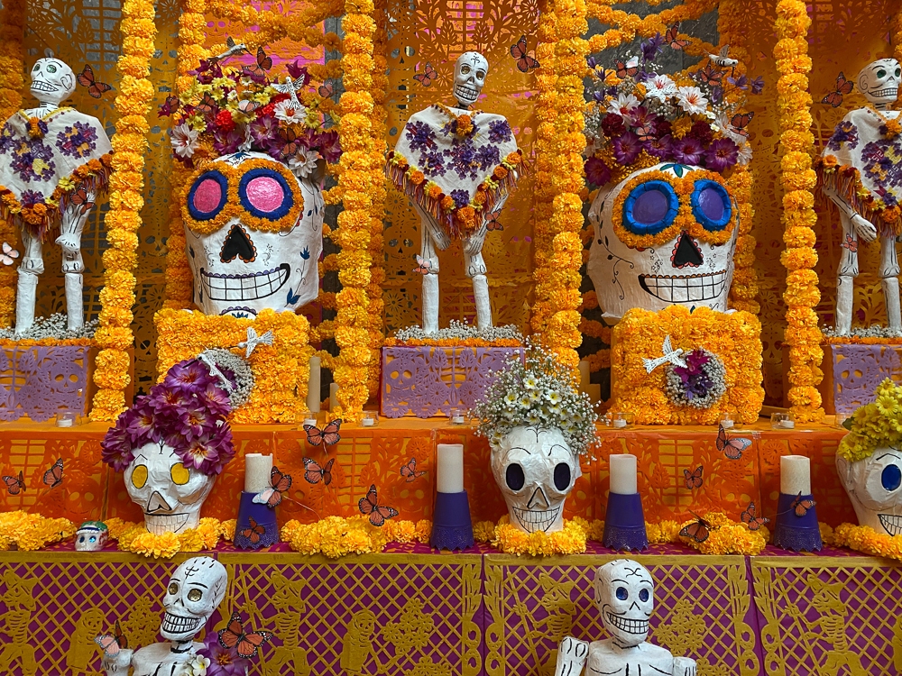 Der Altar des CIMA – Círculo Mexicano Alemán – im MARKK ist dieses Jahr prächtig mit Blumen, Schmetterlingen und Kolibris geschmückt, denn die Blumen stehen dieses Jahr im Mittelpunkt der Feierlichkeiten. Ohne Blumen ist der Tag der Toten im Mexiko undenkbar. In der Woche 03.11. – 07.11.2025 werden wir am Altar im MARKK über die Bedeutung des Totentages in Mexiko sprechen. Warum wird er fröhlich begangen? Welche Bedeutung haben die Gaben? Für wen sind sie gedacht? Welche Wurzeln hat das Fest und was bedeuten die Blumen? Das Bildungsangebot wird auf Deutsch, auf Spanisch oder bilingual durchgeführt und eignet sich besonders für Spanischlernende, zum Beispiel für Schulklassen und Erwachsenengruppen.